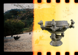 What if to see the fallen skies of the Amazon one had to look at the soil, look at the clay and ceramics found on the shores of the Tapajós River? On a visit to the Berlin Ethnographic Museum in 2019, at the invitation of Barbara Marcel, the also artist, lawyer and indigenous activist Vândria Borari had for the first time contact with the collection of pre-Columbian art located in Berlin. Amidst the museum's large collection of South Amerindian pieces, Vândria encountered Tapajonic vases, amulets and ceramic fragments, material culture of her ancestors. The collage resulting from the dialogues between the two brings together one of the vases from Berlin's collection; drawings by German-Brazilian ethnologist Curt Niemuendajú of one of the oldest cave paintings in the Amazon, located at the archeological site of Monte Alegre, Pará; and a photograph by Barbara Marcel of vultures sunbathing on Carauarí beach in Alter do Chão. According to Tapajonic cosmology, vultures are animals capable of connecting the immanent world with the transcendental realm. Regarded as funerary agents in some cultures around the world, they continue to be important interspecies caretakers in the ecological balance of the Amazon biomes, as well as sacred animals for the Borari indigenous people. In the Tapajonic ceramic vase acquired by the Berlin Museum in 1932 by the museum's former director, art historian Erich Wiese, we see female figures of caryatid women supporting the base of the vase and vultures on top of the piece. The collaborative project between Vândria Borari and Barbara Marcel is part of a long-term project on Tapajonic ceramics in European museums and a film to come under the title of Caryatides.